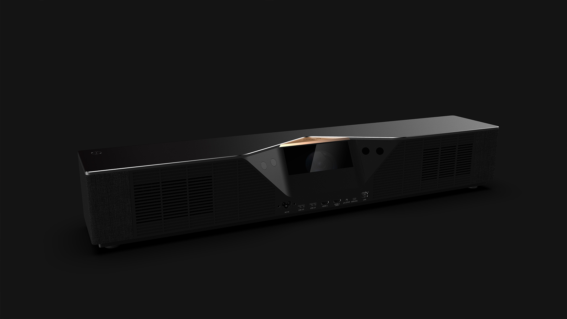 Drawing inspiration from "light," this projector integrates the light engine with a golden top panel, creating a visual effect of emanating brilliance. Its elongated form fits common media console layouts, while the blend of metal and fabric materials hints at enhanced audio and harmonizes with home interiors.